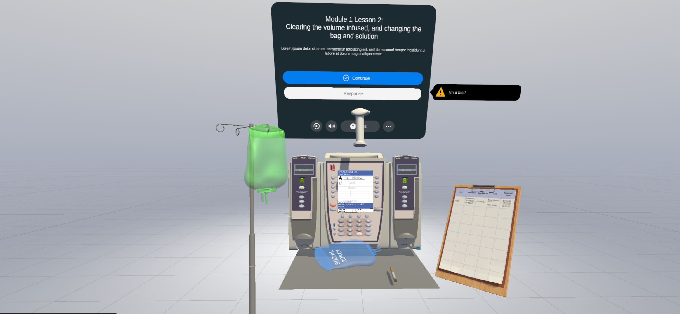 Our flagship simulation is a virtual IV pump, developed to help students practice setup, programming, and troubleshooting procedures. Piloted with 30 nursing students, it is being deployed in full courses starting Fall 2025.